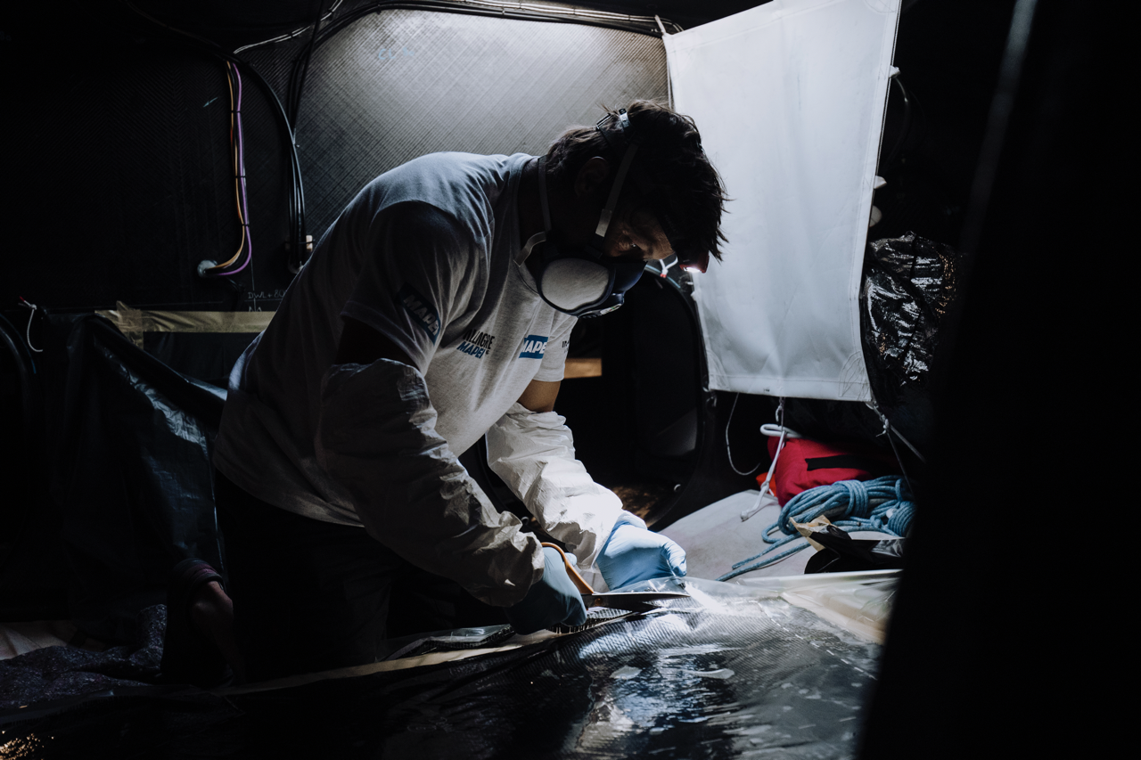 “We suffered quite a bit of damage,”explains Ambrogio Beccaria. “The most visible was the J0 headsail—but in reality, that was almost the easiest part: it’s irreparable, so we simply took another J0. The mainsail was dismantled and repaired—that was also relatively straightforward. But then we broke the entire starboard rigging: the outrigger, the D0 stay, the D1 shroud, and the D2 shroud. The shrouds couldn’t be repaired, so we had to replace them all. The outrigger was repairable, but not within the available time, so again, we replaced it. Once all the cables were changed, the real problem was the chainplate. We had to bring in architect Antoine Koch and structural engineering firm GSea Design to establish a repair protocol and make sure we could sail at 100% of the boat’s potential. That took time—many layers of fabric had to be applied in a hard-to-reach area… we even had to dismantle the ballast to get there. We went through an emotional rollercoaster, moving from uncertainty to the possibility of getting back into the race. Today, we’re super happy, super excited… I just can’t wait to get back out sailing!”
