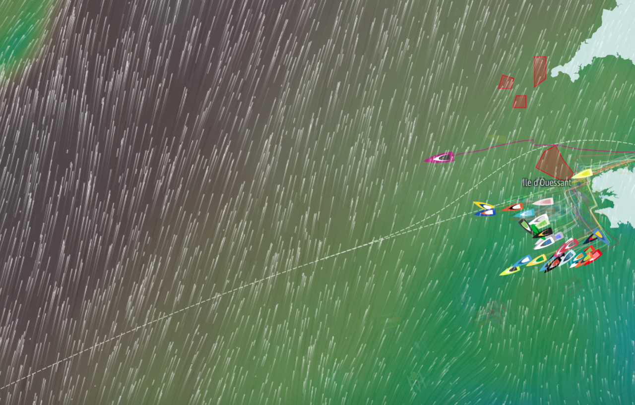 The early stages saw the skippers beating along the Brittany coast into a fresh west-southwesterly air stream with all but one of them – Louis Duc on Fives-Lantana Environment – electing to go inside the Traffic Separation Zone off Ushant. After 20 hours at sea Duc was the leader in the ranking by virtue of being furthest west, but the real action was happening about 110 miles southeast of him.