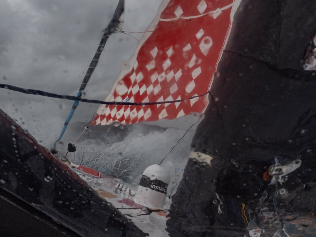 The storm jib is a tough, tiny triangle of sail cloth that is designed to take the worst of beatings in extremely windy conditions. There may be times when the boats are flying the storm jib only, in apocalyptic conditions that they’d rather not be caught in, but which they might well encounter in the Southern Ocean for example.