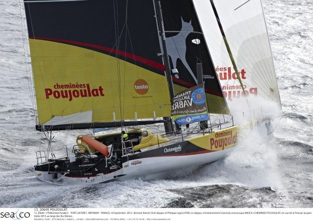 Powered up in a full-on drag race after a ‘safe’ start to the course to negotiate the rough weather, the leaders of the IMOCA class are currently bowling along in the north-easterly tradewinds of between 17 to 23 knots. The average speeds displayed by the monohulls make for impressive reading! Downwind, in a good swell, which is gaining in size the further south the fleet sail, the speedo is regularly flirting with 25 knots. The canting keel is whistling and the bow waves are submerging the deck and swamping the cockpit, which is protected by a sliding cuddy on the most modern boats. Such protection is a very welcome addition for the sailors who, with full sail aloft, are taking it in turns at the helm to optimise the trajectory and avoid broaching. “We’re sailing under full main and large spinnaker. We’ve got as much sail up as we can! It’s fast, though it’s a bit tense as running downwind is quite a tricky point of sail. We’re constantly on the edge so we’re spending a great deal of time at the helm. As such we’re switching position as much as we can to avoid overcooking things in a situation where the slightest mistake costs very dearly in the ranking,” explained Bernard Stamm this morning aboard Cheminées Poujoulat, which was up to second place on morning leaderboard. On what continue to be cross seas, the dampness is a constant, even though the temperatures are gradually on the increase. The sailors competing in this 11th Transat Jacques Vabre haven’t yet had the chance to remove their foulies and it’s likely to take a few more days yet…