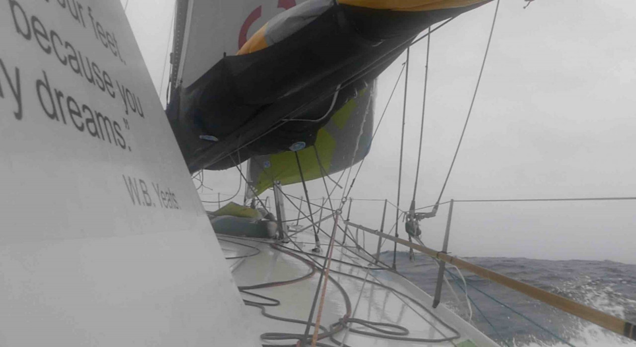 Personally O’Coineen is reeling from his voyage so far. “I have never experienced so many deep depressions, one after the other, on the Atlantic. In many cases the best I could do was go around them and take the safe corner and avoid the middle bits… The most wind I saw on the instruments was 46 knots which is very scary territory and you feel kind of helpless staring at it and listening to the crashing of the boat. I have never seen wind do so much damage to a sail.” Otherwise, he says the boat (formerly Mike Golding’s Ecover/Gamesa) is mostly fine, as is he. “Personally I have no injuries, just a lot of small cuts and bruises. My system is shaken, but otherwise I’m in good shape.”