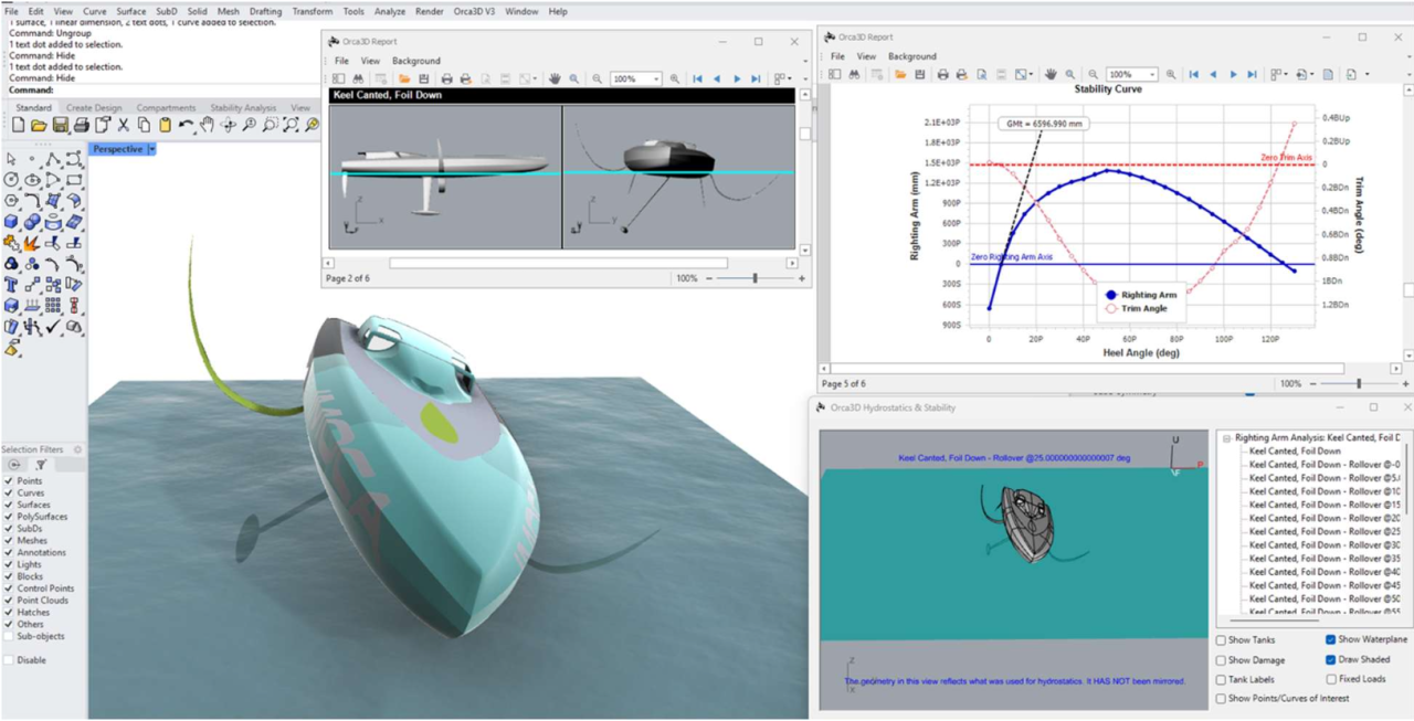 From sail shape to hull design, every decision is informed by data-driven insights, ensuring that the boats can perform under the most extreme conditions. Orca3D’s software complements these efforts by providing a detailed analysis of the boat’s stability in various conditions, ensuring that safety is never compromised in the quest for speed.