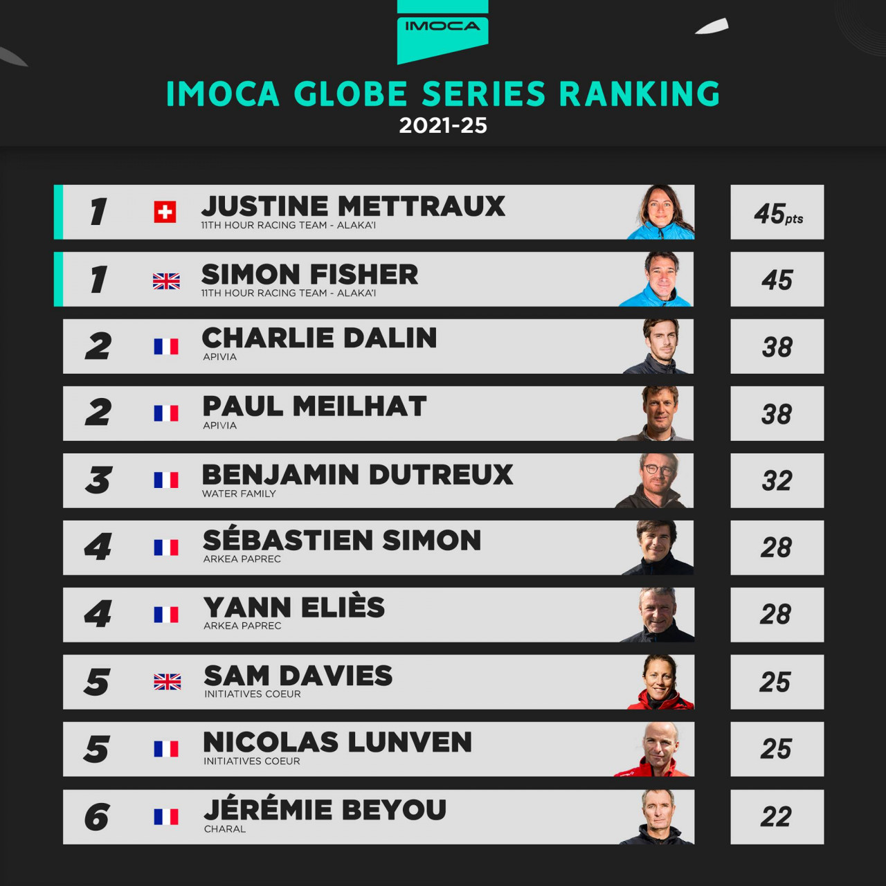 In this race the mixed crews are led by podium contenders Simon Fisher and Justine Mettraux on 11th Hour Racing Alaka’i. Alongside them on the start line will be Sam Davies and Nicolas Lunven on Initiatives-Coeur, Isabelle Joschke and Fabien Delahaye on MACSF, Manuel Cousin and Alexia Barrier on Groupe SÉTIN-4myplanet and Louis Duc and Marie Tabarly on Kostum-Lantana Paysage.