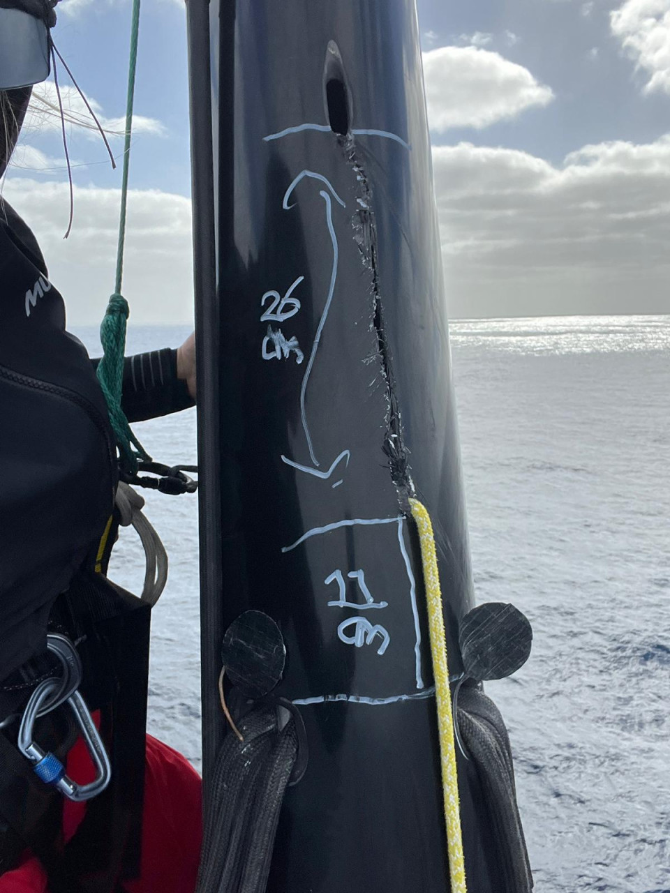 Team Malizia finds a crack at the top of their mast during Leg 3 of The Ocean Race