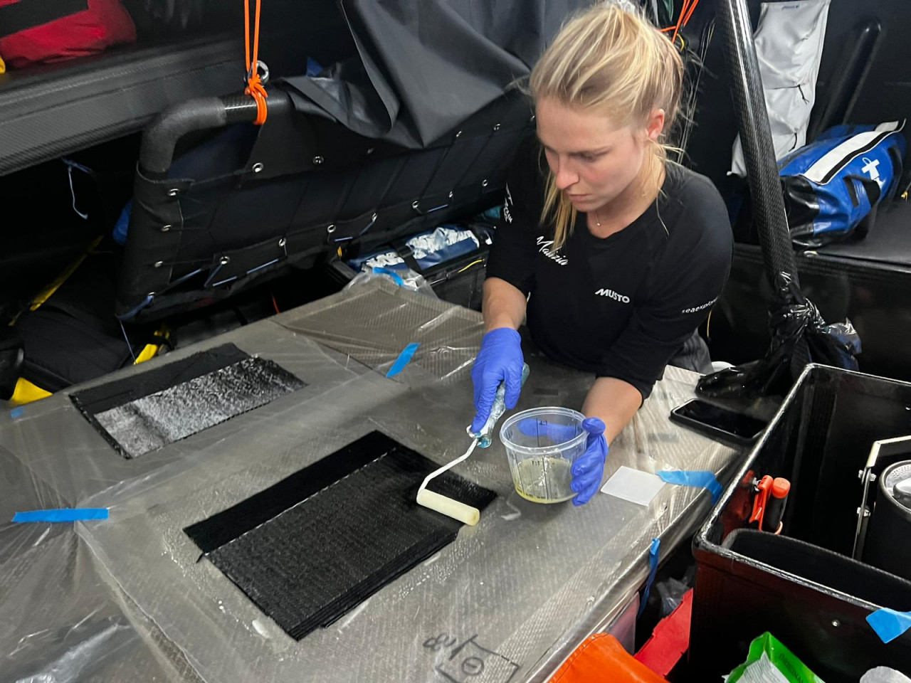 The team starts to prepare the materials inside the boat, collecting everything they need from the spares bags inline with the shore team's instructions. Nico is focused on keeping the boat on course and managing the surroundings and Antoine is documenting everything, everyone has their role! Boris is the one coordinating all the departments and crucially communicating with land and our tech team (the fountains of knowledge) whilst Rosie is preparing the laminate. Questions have to be agreed in advance, who is going up, who is mixing the resin, who will wet out the fibre, do you have everything you need.