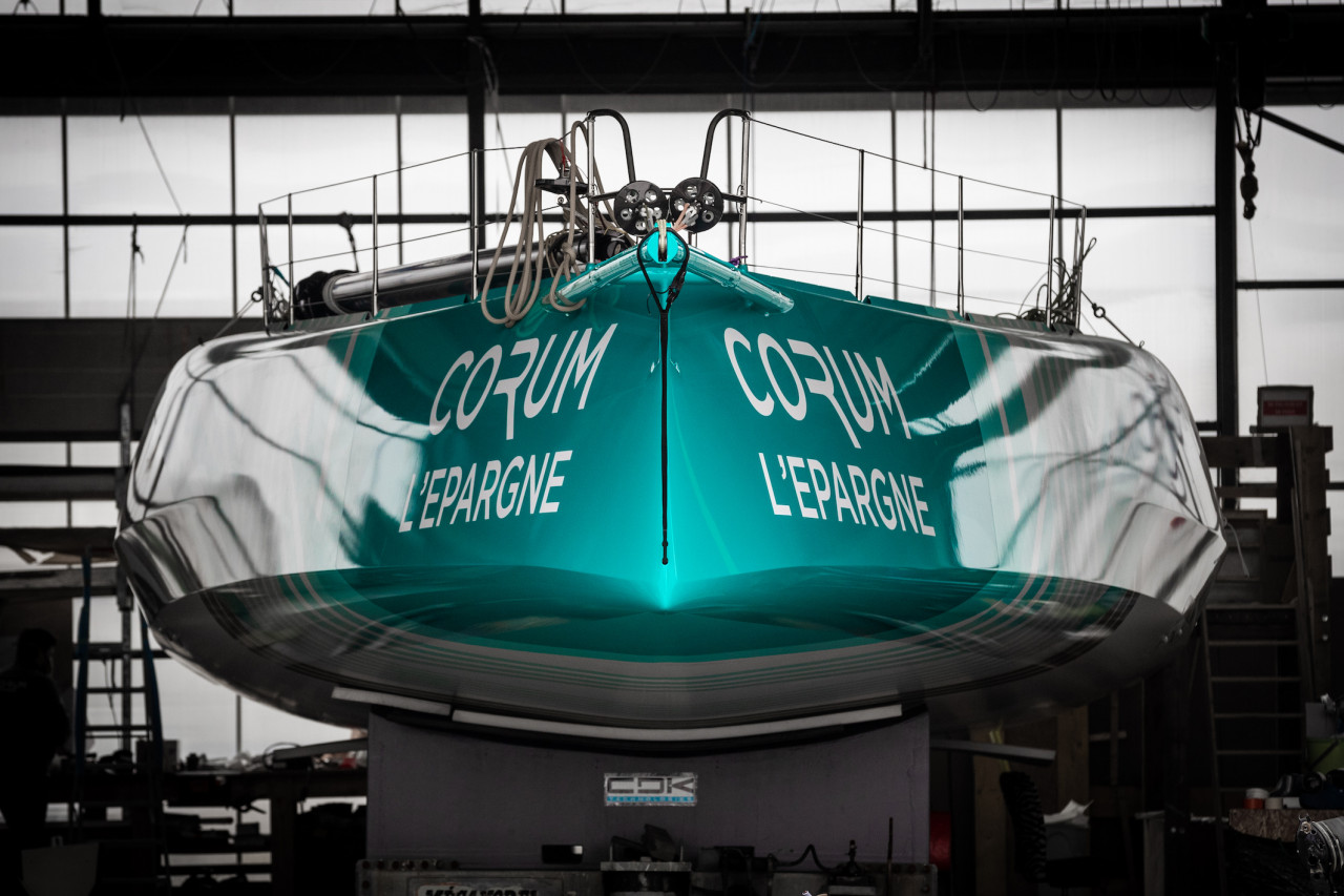 With construction having commenced over a year ago, the IMOCA CORUM L’Épargne is now entering a crucial phase. Indeed, following months of design by naval architect, Juan Kouyoumdjian and construction and assembly at the Mer Agitée yard owned by project manager, Michel Desjoyeaux, the boat hit the water today.