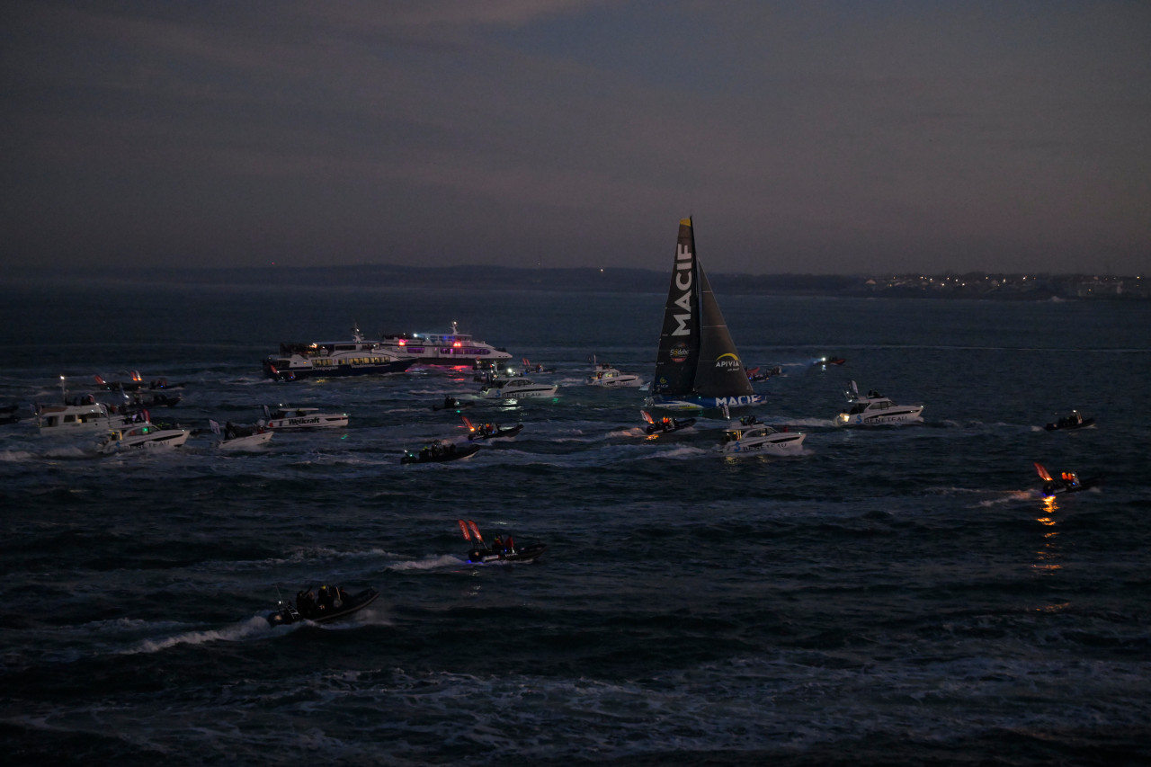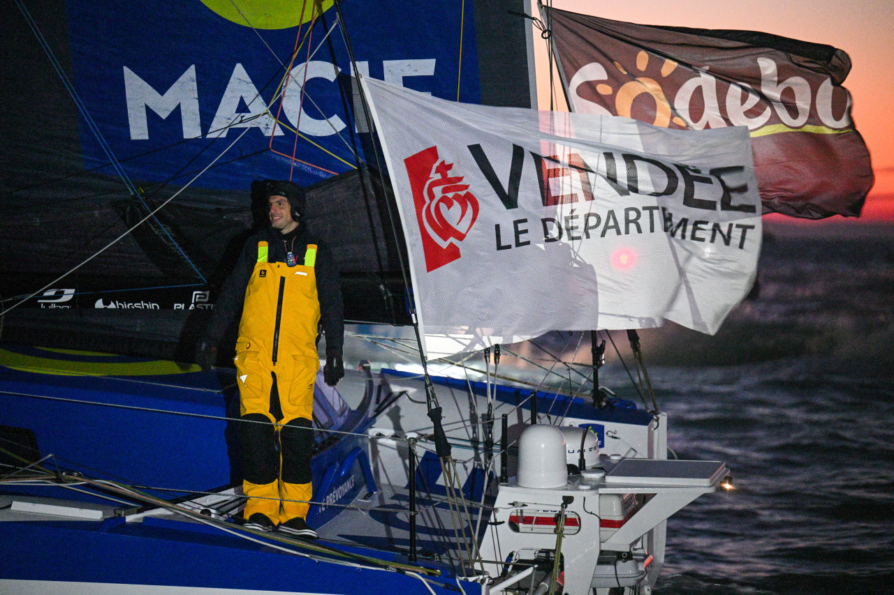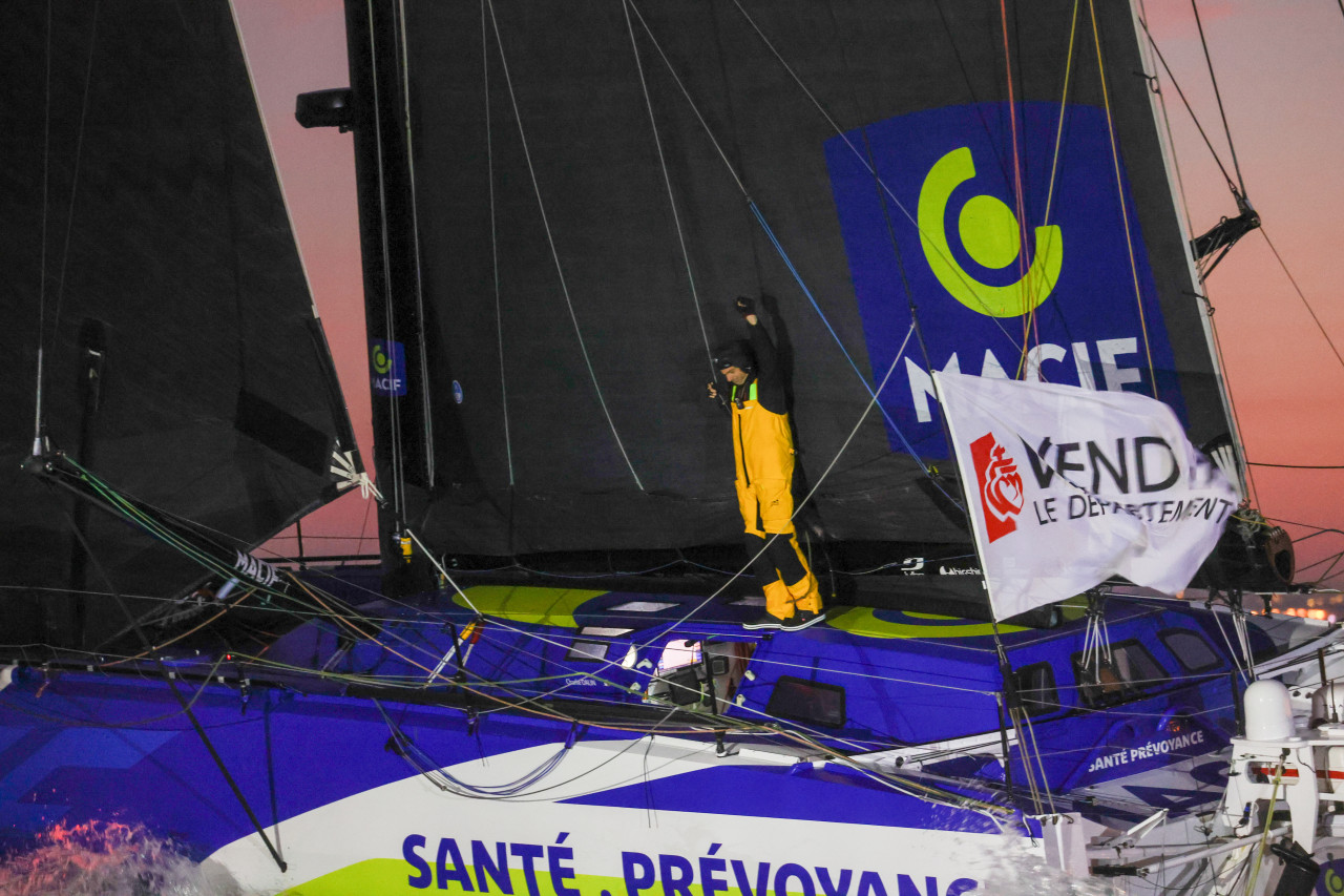 Après une dernière nuit à tricoter dans les petits airs au Sud des côtes bretonnes, Charlie Dalin a franchi la ligne d’arrivée aux premières lueurs du jour ce mardi matin, à 08h24.