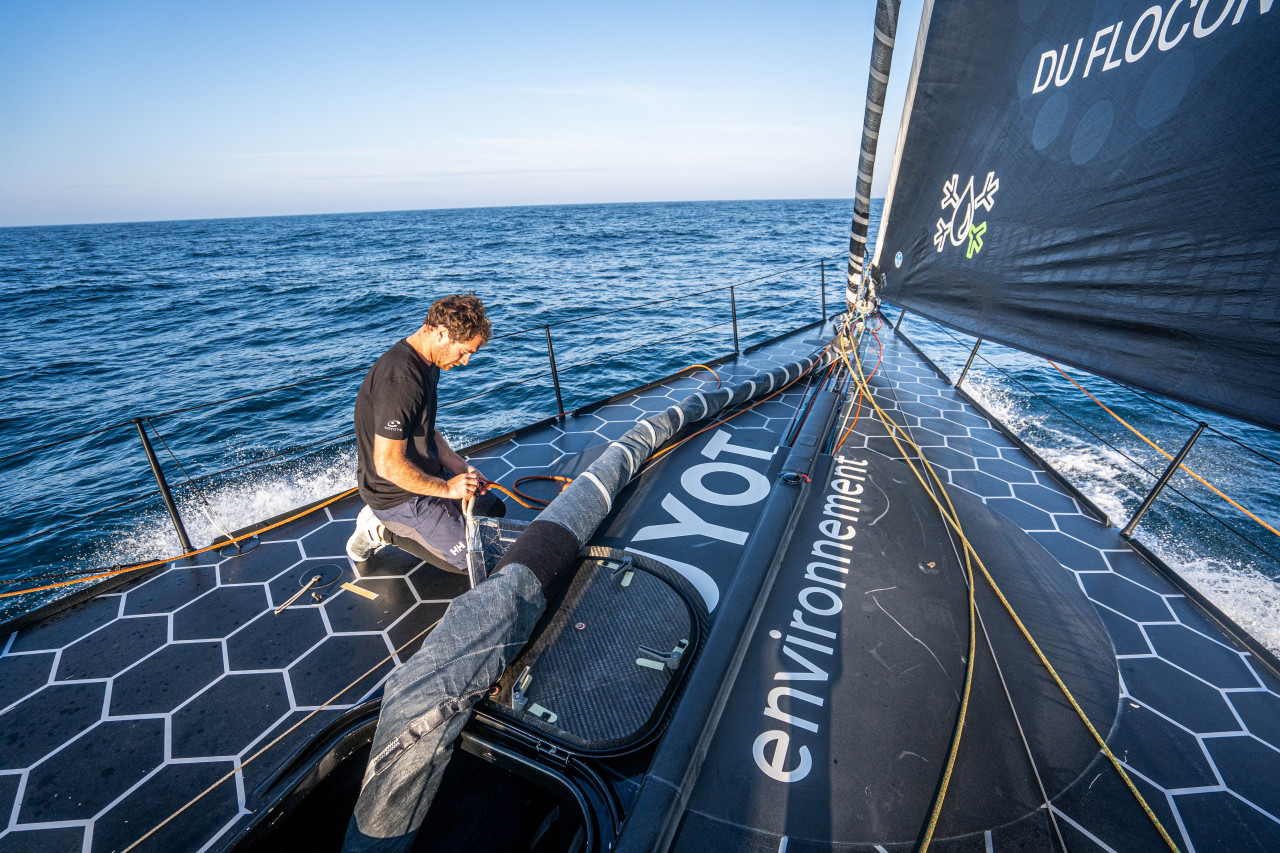 « La situation n’est pas simple. On est en plein dans le Gulf Stream. C’est un coin un peu étrange. Des phénomènes naissent juste au-dessus de nos têtes. C’est compliqué d’anticiper quoi que ce soit », a résumé Jérémie Beyou (Charal) à la vacation de ce jeudi matin, après un début de course pour le moins complexe. De fait, si les premiers milles ont été délicats, la faute à de petits airs erratiques, la première nuit a été chaotique avec un épisode orageux aussi soudain que violent. « Alors que l’on n’avait pas de vent du tout, d’un coup c’est rentré à 35 nœuds ! », a détaillé le vainqueur de l’épreuve en titre qui s’attendait à ce phénomène mais qui a toutefois été surpris par son intensité, de même que l’ensemble de ses concurrents. « L’orage s’est formé juste devant nos étraves. Les bateaux déboulaient à 20 nœuds avec des éclairs tout autour. C’était très actif, très impressionnant et même un peu flippant. L’ambiance était assez apocalyptique. Il fallait être bien aux manettes ! », a confirmé Thomas Ruyant (VULNERABLE) qui a, comme la plupart de ses adversaires, préféré jouer la carte de la prudence et ralentir un peu le rythme pour éviter les pépins avant, malheureusement, de retrouver de nouveau de petits airs erratiques en milieu de matinée. « Dans l’instant, j’ai trois nœuds de vent. J’avance presque uniquement avec le courant du Gulf Stream qui secoue un peu le bateau, et je tente de négocier au mieux toutes les transitions », a indiqué le Nordiste qui avait un temps espéré conserver du vent fort pour rejoindre le waypoint Share The Ocean, sa prochaine marque de parcours, mais qui n’a pas d’autre choix que de se montrer un peu patient en attendant que la situation s’éclaircisse. De fait, en bordure du Gulf Stream, le chaud et le froid des courants mais également des masses d’airs se confrontent et génèrent beaucoup d’instabilité. Pas facile, dans ces conditions, d’avoir un plan d’action précis en tête et encore moins de faire avancer les machines, surtout lorsque le vent peine à dépasser les 2-3 nœuds. « En réalité, c’est surtout le courant qui décide de là où l’on va pour le moment ! », a commenté Benjamin Dutreux qui relève actuellement une température d’eau supérieure à 25° et compose, comme ses rivaux, avec bonnement cinq nœuds de courant, ce qui lui donne l’impression de jouer avec un drôle de vent, mais qui a le mérite de le faire avancer a minima.