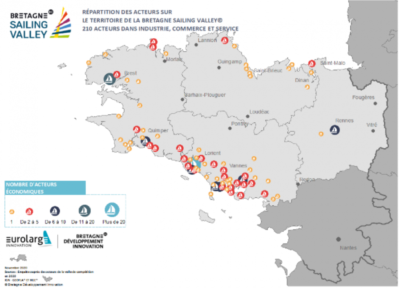 Le territoire breton, berceau de la voile de compétition, concentre un grand nombre d’acteurs de la filière dont le rayonnement dépasse largement les frontières françaises. Créé en 2005, le programme Eurolarge Innovation, porté par Bretagne Développement Innovation, accompagne cette filière technologique et aide au développement d’un écosystème de 210 entreprises qui représente près de mille emplois sur le territoire et génère un chiffre d’affaires annuel de 83,5M euros. « Cette filière compte économiquement et technologiquement. Notre mission est de réunir les entreprises en lien avec les laboratoires et les institutions pour faire face ensemble aux défis de la filière qu’il s’agisse d’ouverture à l’international de transferts de technologies vers d'autres secteurs industriels d'émergence d'innovations durables et de transition environnementale » explique Carole Bourlon, en charge des filières voile de compétition et composites chez Bretagne Développement Innovation et pilote du programme Eurolarge Innovation. « Depuis 2016, cette filière est en constante croissance. En 2019, le chiffres d’affaires a progressé de 16% et le secteur a fait preuve de résilience en 2020 pendant la crise de la covid 19 » poursuit-elle.