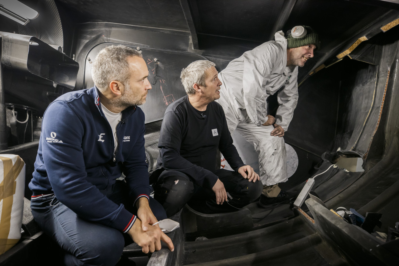 Une fois les foils trouvés, il a ensuite fallu monter une équipe pour mener le chantier. Fabrice Amedeo a alors décidé d’intégrer les Anglais au projet et de travailler avec eux. « L’équipe qui a participé à la construction du dernier Hugo Boss était disponible, explique le skipper. Nous avons convenu qu’ils construiraient les puits de foil et viendraient les installer à Lorient. » Quatre Anglais de Pro Build Composites ont donc rejoint le Team Nexans – Art & Fenêtres. « Ils ont démonté les systèmes de foils actuels et vont avancer l’implantation des nouveaux foils de 55 cm, donc ils vont ouvrir à nouveau le bordé, puis le pont et enfin installer les nouveaux systèmes. »