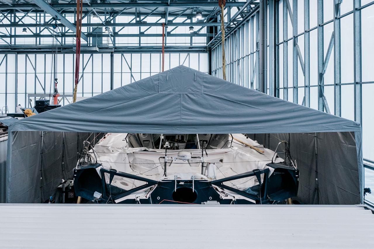 En chantier depuis le mois de décembre, le monocoque de Fabrice Amedeo est en pleine transformation avec la mise en place de foils en C.